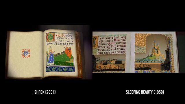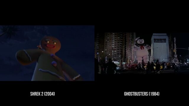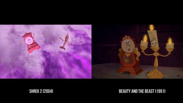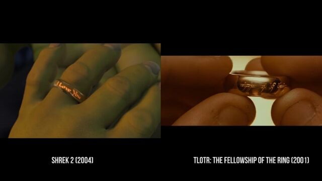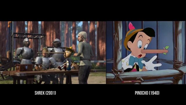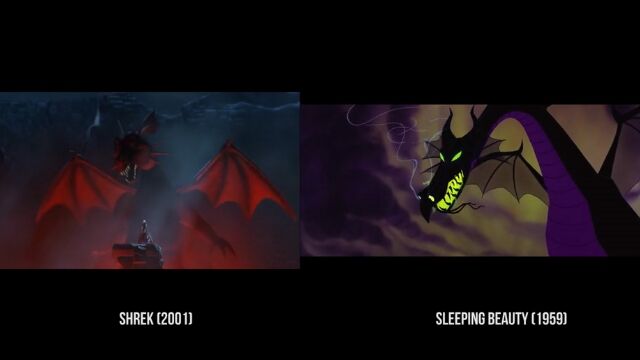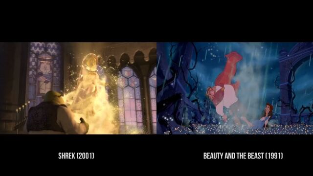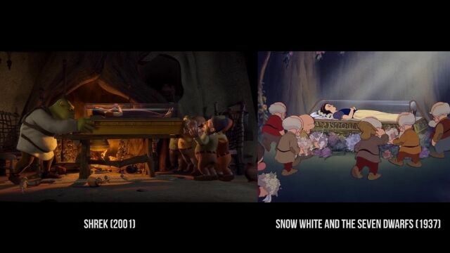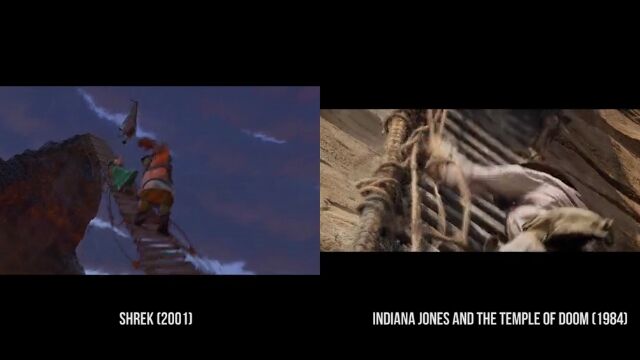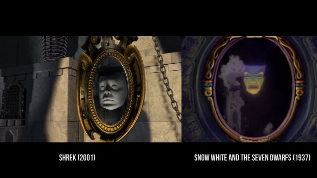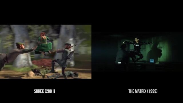 沼に住む怪物シュレックが主人公のコメディー映画「シュレック」および「シュレック2」の中で、他の映画をオマージュしたパロディーシーンを抽出、元ネタとなる映画のシーンと比較再生した映像。