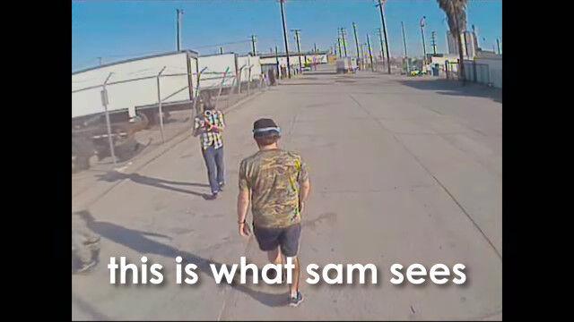 自分の背後から撮影しているカメラの映像をヘッドマウントディスプレイに映し、第三者視点で行動。
