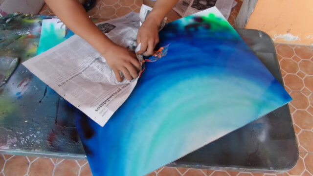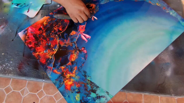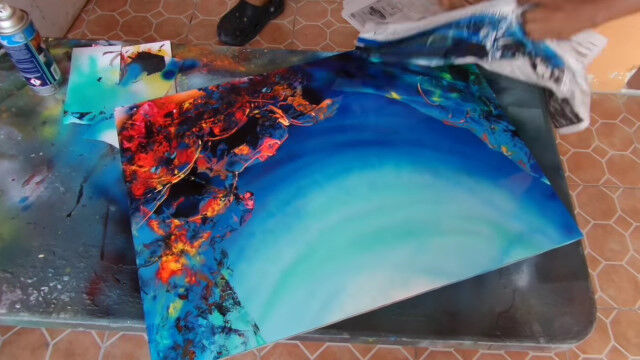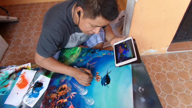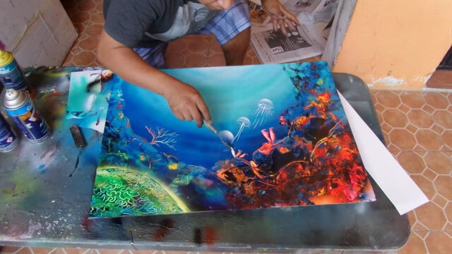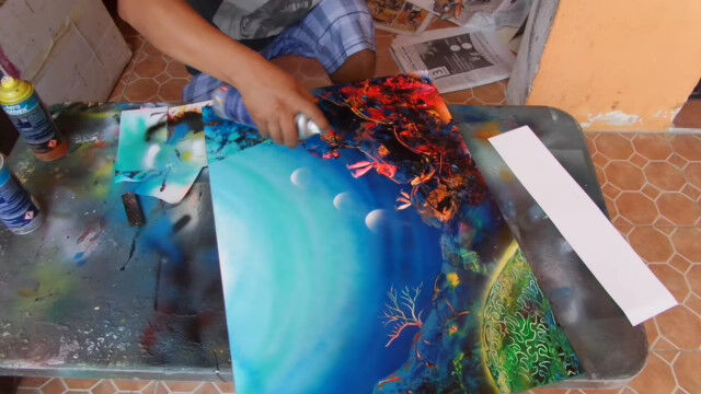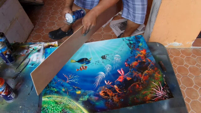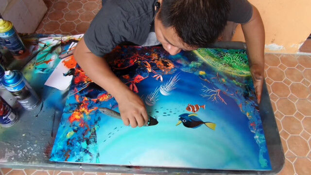 みるみるうちにサンゴが描かれ、ニモとドリーと仲間の魚たちも描かれていき、わずか16分程度でスプレー塗料がメインとは思えない絵画が完成。