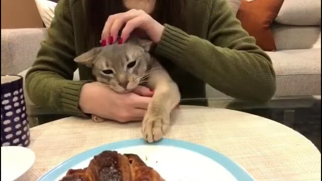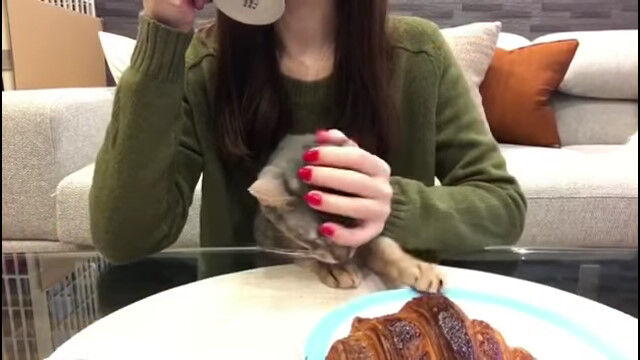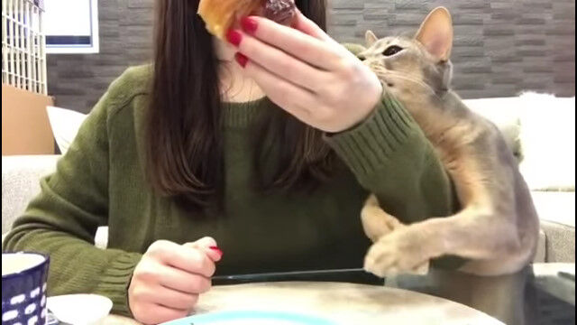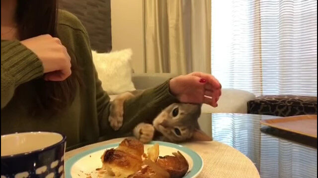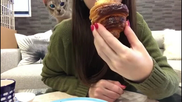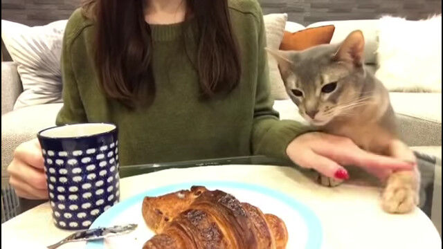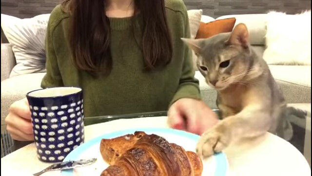 お姉さんのクロワッサンが食べたくて、執拗に狙いつづける猫