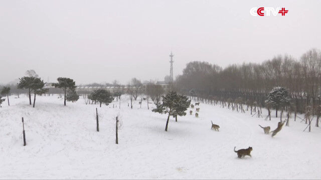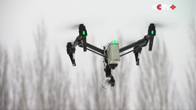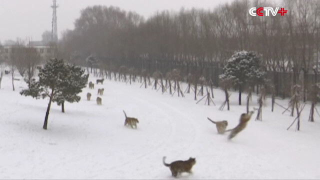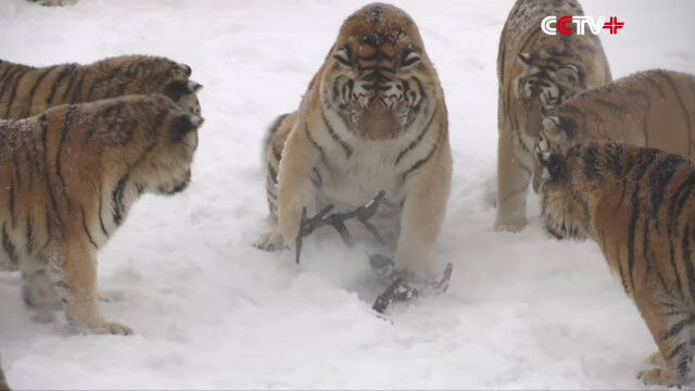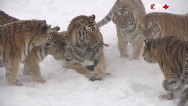 中国、黒竜江省の希少動物保護施設で、飼育されているシベリアトラたちを撮影するドローン。