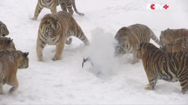 放り投げた生肉に飛びかかる、トラのジャンプ力はなかなか侮れない