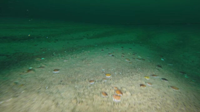 ステルワーゲン・バンク国立海洋保護区でダイバーが撮影した、海底付近をスイスイ泳ぐ若きホタテたちの群れ。