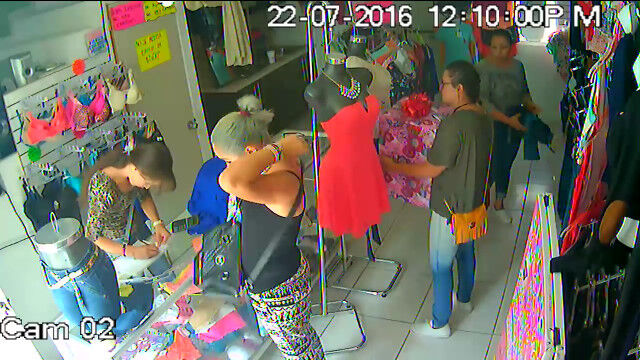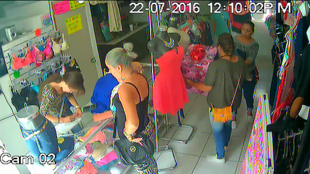 洋服店でズボンを中心に次々と商品を盗んでいく、女性2人組の万引き犯による犯行の瞬間を撮影した、防犯カメラからの映像。