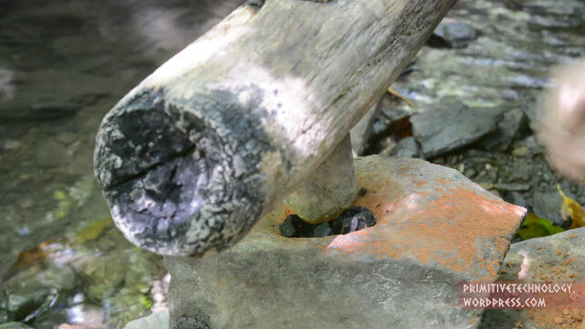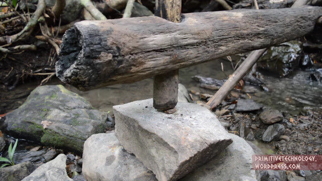 川の水を利用したししおどしのような水力稼働するハンマーで、ゆっくりながらも置かれたものを自動的に砕いてくれる便利なもの。