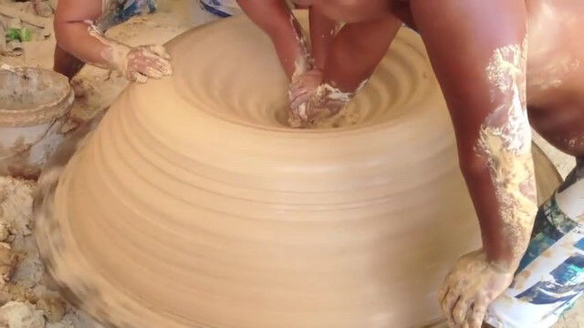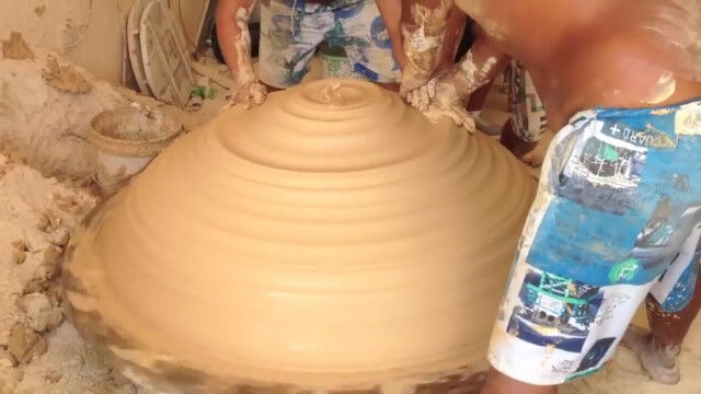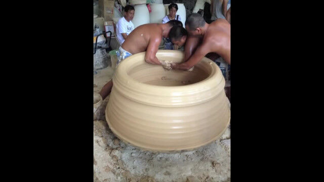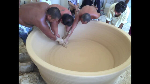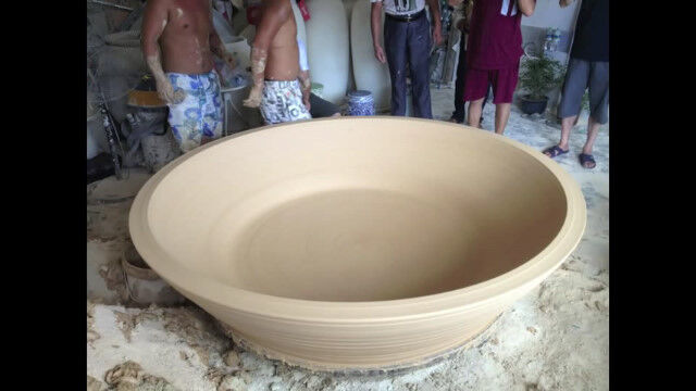 中国、景徳鎮市(けいとくちんし)にて、職人さんが3人がかりで製作する巨大陶芸。