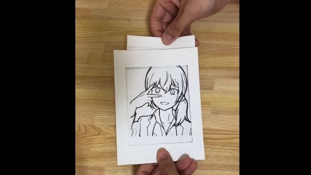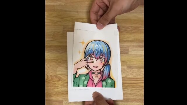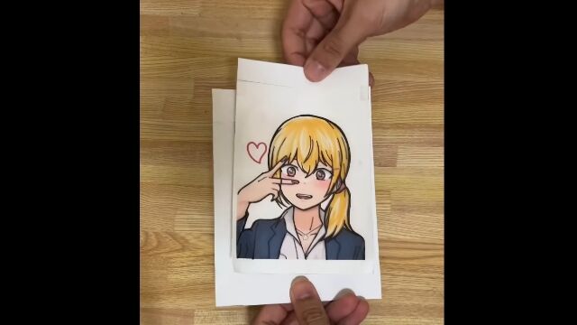 黒髪の女の子のイラストが、紙の枠に入れると線画になり、ふたたび取り出すと金髪の女の子に。