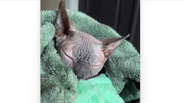 体毛がほとんど生えていない、スフィンクスタイプの猫を洗って、お風呂に入れてあげる映像。