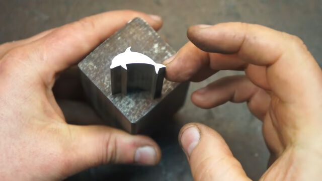 イルカの形にカットされた2種類の金属素材を組み合わせて、刃の部分にイルカの姿がたくさん刻まれたナイフを作る鍛冶職人。