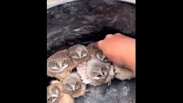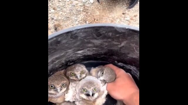 バケツの中から1羽ずつ持ち上げられ、人工の巣穴へとご案内されるアナホリフクロウの雛たち。