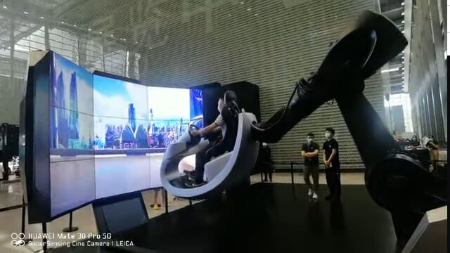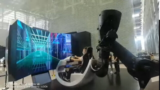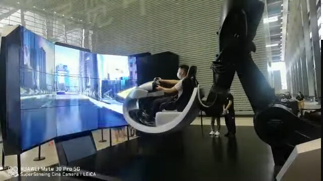 大画面のディスプレイを前に、ハンドルコントローラーやアクセル、ブレーキのついた座席を、産業用ロボットで動かすドライブシミュレーター。