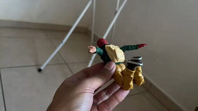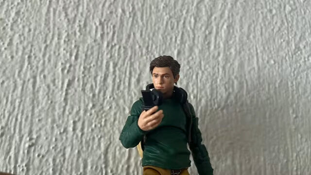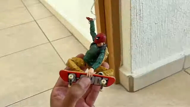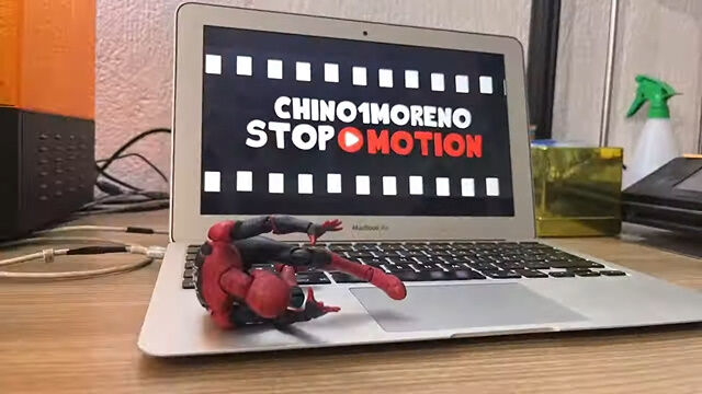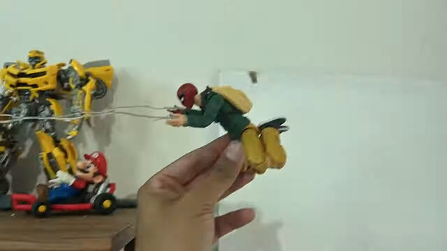 部屋の中を背景に、スパイダーマンのフィギュアを動かしたストップモーションアニメーション。