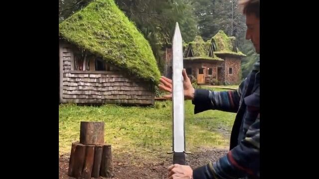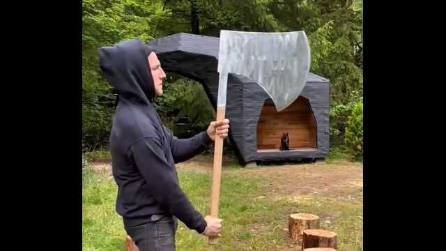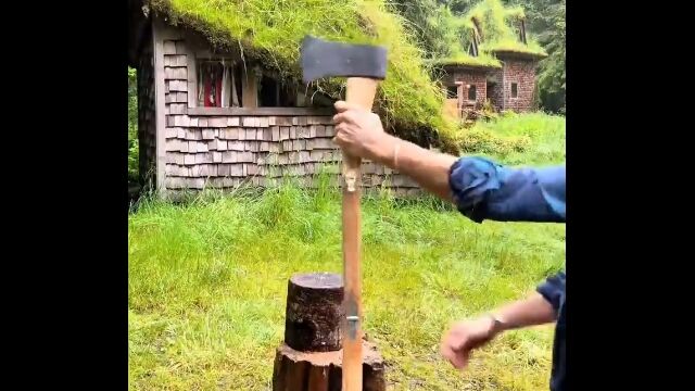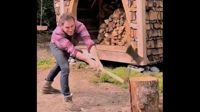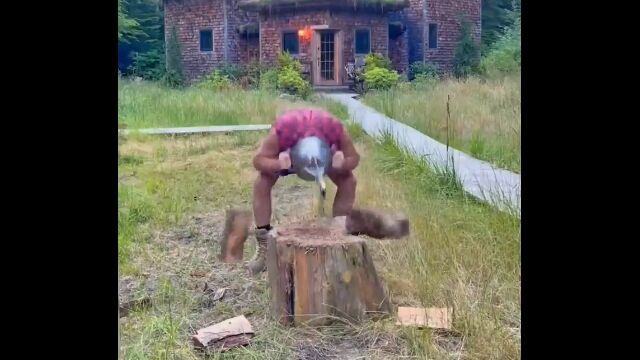 彼はあえて斧やそれらの機械を使わず、奇妙奇天烈な道具を使って薪割りに挑んでいる。
