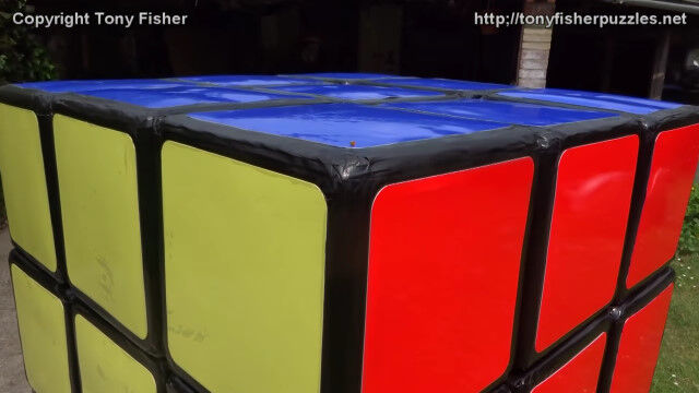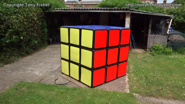 1辺が1メートル57センチ(前回動画では1メートル56センチ)の巨大ルービックキューブを自作したトニー・フィッシャーさん。