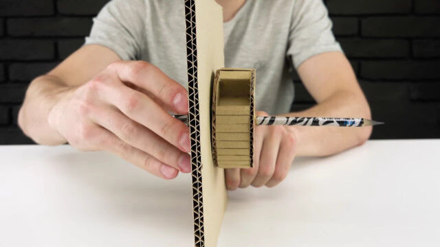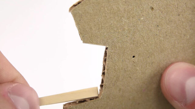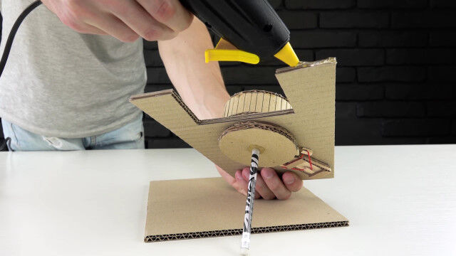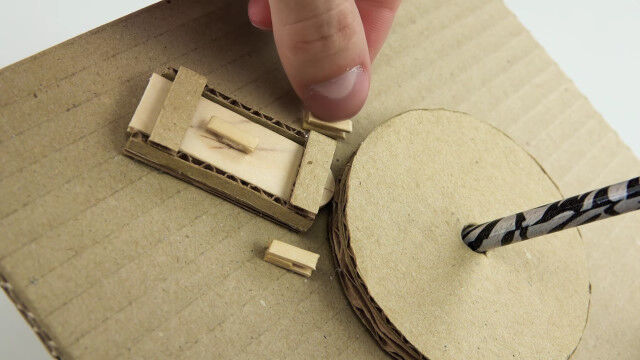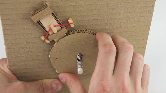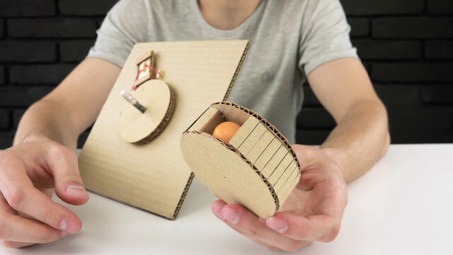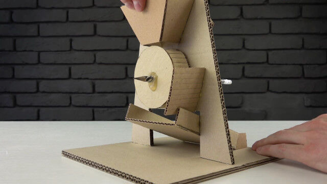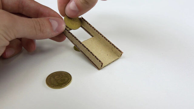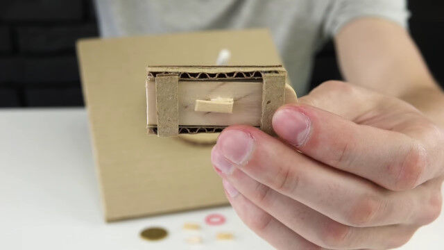50セント硬貨よりも小さな硬貨だとレバーは回らないようになっている、ダンボールを使ったガムボールの自動販売機の作り方。