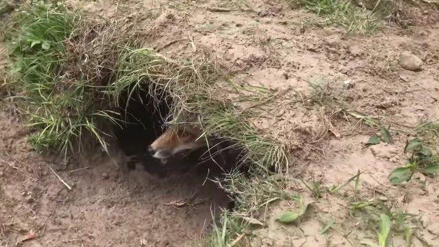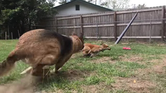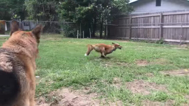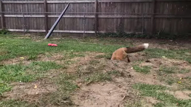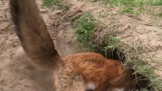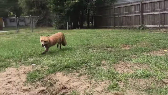 飼い主が庭に作った短い地下トンネルを利用して、大はしゃぎで駆け回るペットのキツネくん。