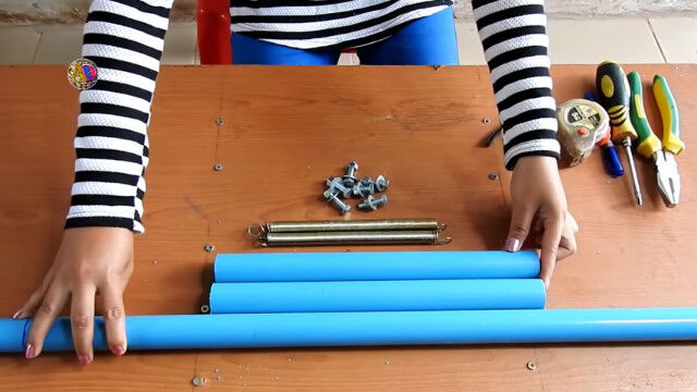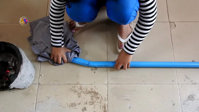 塩ビパイプを素材に、バネやネジを使って弓矢を自作するカンボジアの女の子。