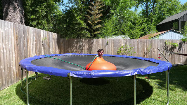 トランポリンが破れてしまいそうなほど水で膨らませた風船が、一瞬で割れる様子をじっくり観察できる。