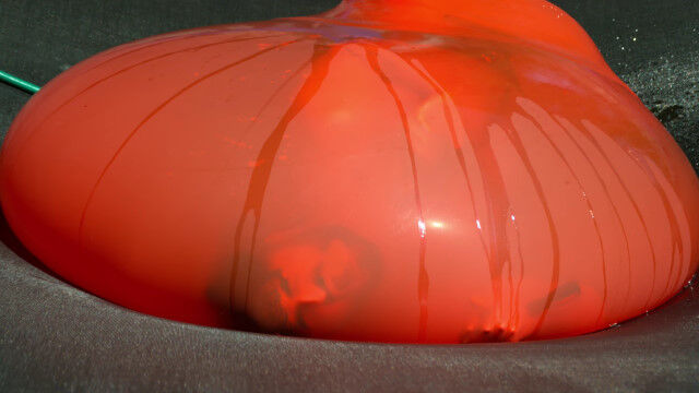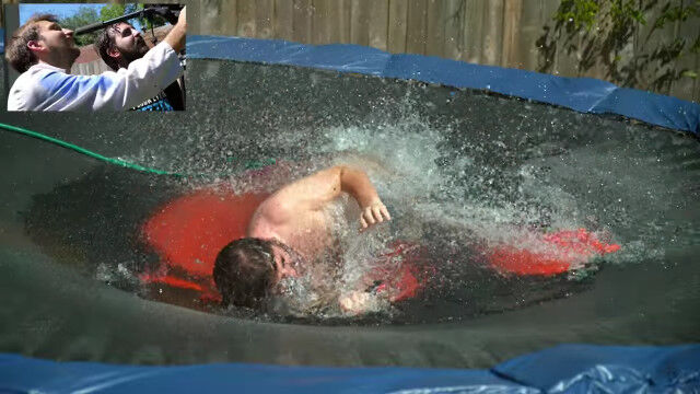 トランポリンの上で巨大な水風船の中に入り込み、内側から水風船を割った瞬間をハイスピードカメラで撮影した超スローモーション映像。