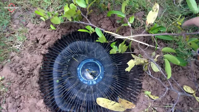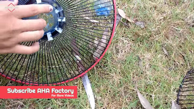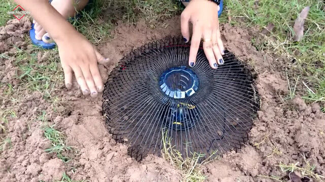 扇風機のファンに触れないように周りを覆う金属製のカバーを使った、ヘビを捕らえる罠の作り方。