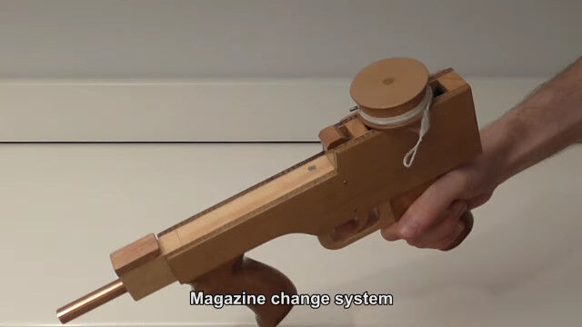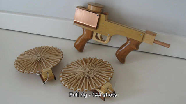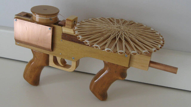 ディスク状のマガジンに輪ゴムを装填し、ディスクを回転させて輪ゴムを連射する輪ゴムマシンガン。