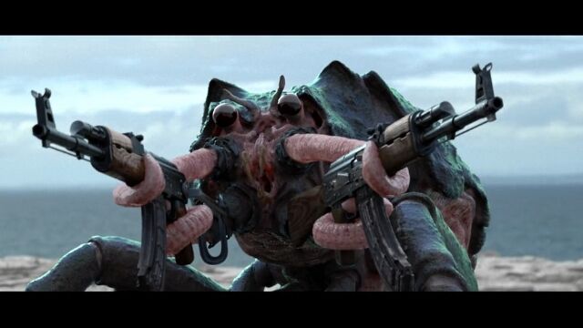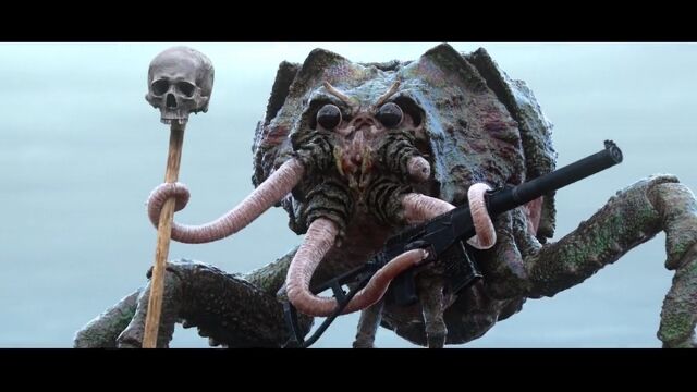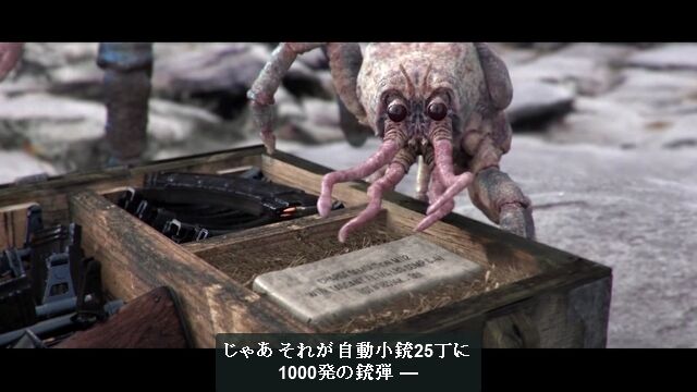 カニのような甲殻や眼球を持ち、触手を器用に操る知的生命体を相手に武器を売る、武器商人の取引を描いたSFショートフィルム。