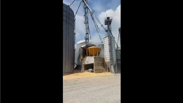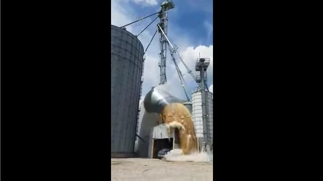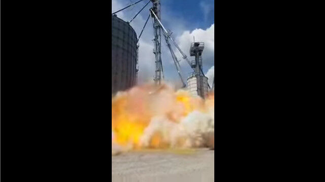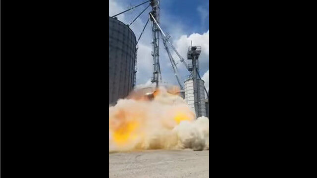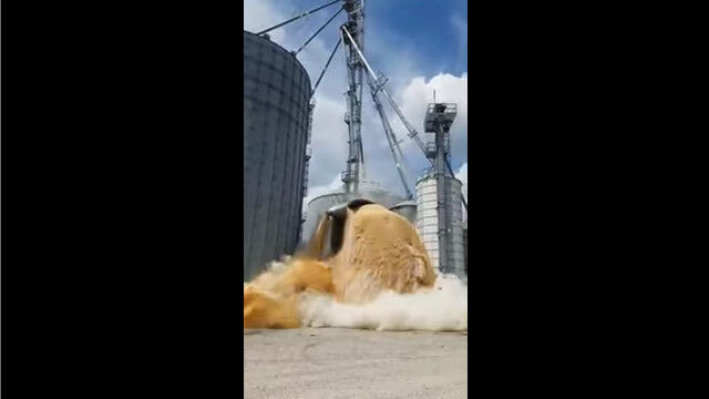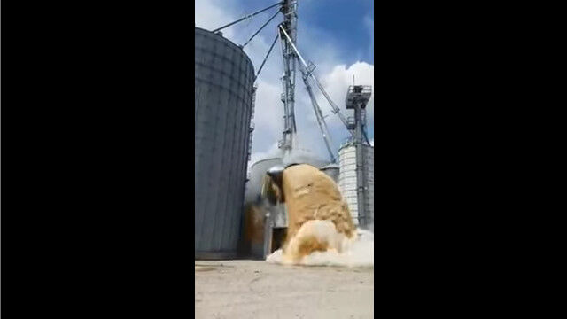 穀物を運搬、貯蔵する穀物エレベーターのタンクが倒壊し、漏れ出た穀物に引火、粉塵爆発してしまった瞬間の映像。