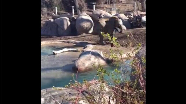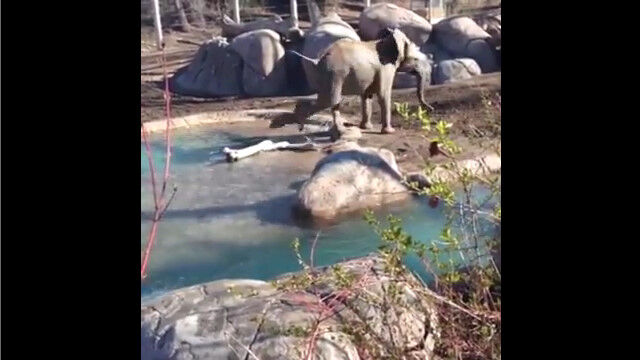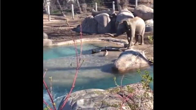 荒ぶるゾウに水をかけられ、蹴られても立ち向かう雁の闘争心が凄い