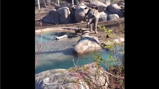 なんだかイライラしているようにも見える様子で、同じエリア内で飼育されている雁に水をかけるゾウさん。