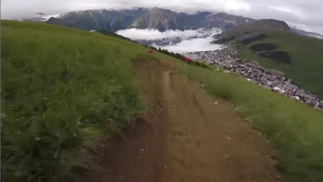 フランス、アルプス山脈にあるスキー場、レ・デュー・アルプの上からスタートし、高低差2500メートル、距離約25キロのコースをマウンテンバイクで駆け下りるダウンヒルレース、マウンテン・オブ・ヘル2017の参加者視点映像。