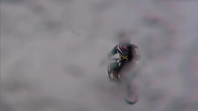 雪深く埋もれたダウンヒルコースを強引に走る、マウンテンバイクのライダー視点映像