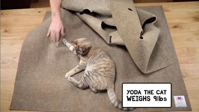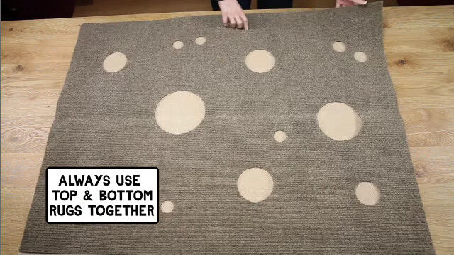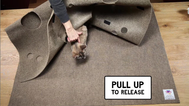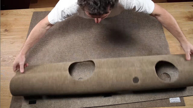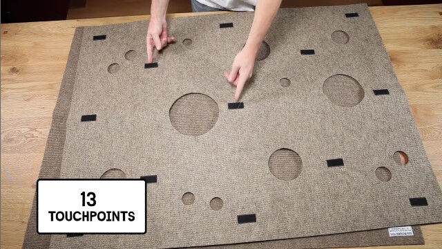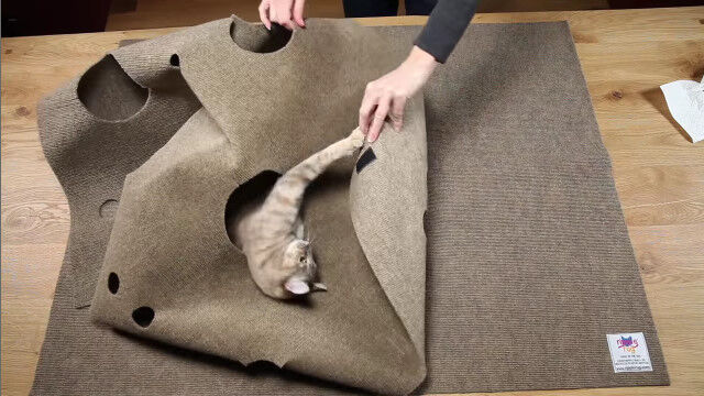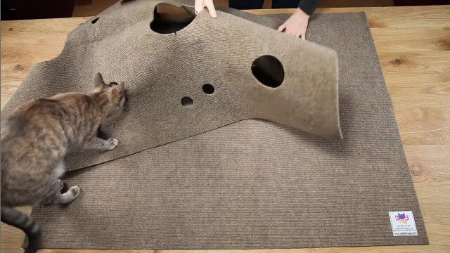 猫が隠れたり遊んだりするスペースを自由に構築できる穴あきカーペット「Ripple Rug」。