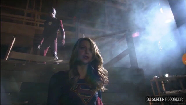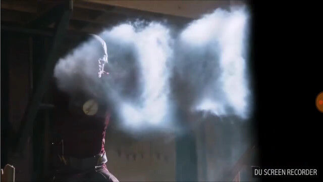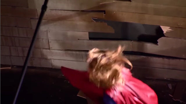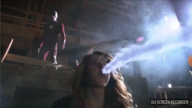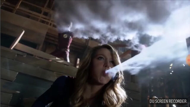 スーパーガールが超人的な肺活量でスーパーブレスを吐き、ザ・フラッシュが超高速で両腕を回して竜巻を起こし、ヴィランを攻撃するというシーン。