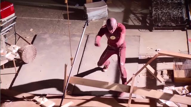 DCコミックスのスーパーヒーロー、スーパーガールとザ・フラッシュが共闘する、ドラマの1シーンらしき撮影舞台裏。