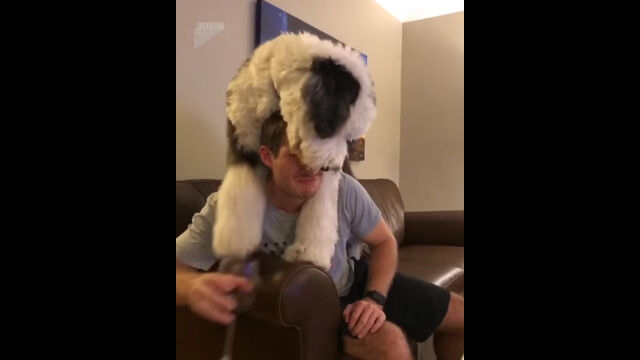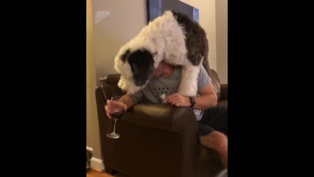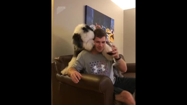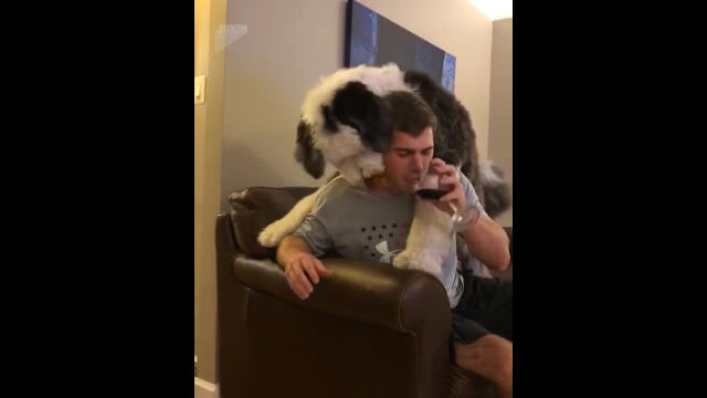 - ワインを飲むのも一苦労。大型犬にのしかかられながら、隙を見てワイン� $ArticleTagsLoop$>