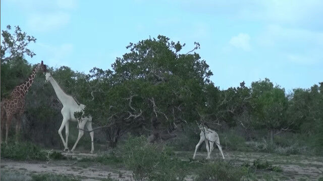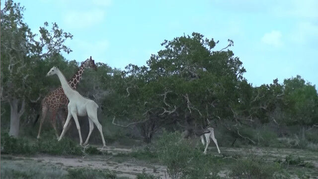 ケニア北東部にて、絶滅寸前のヒロラを保全するレンジャー隊員が発見した白いキリンの親子。