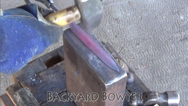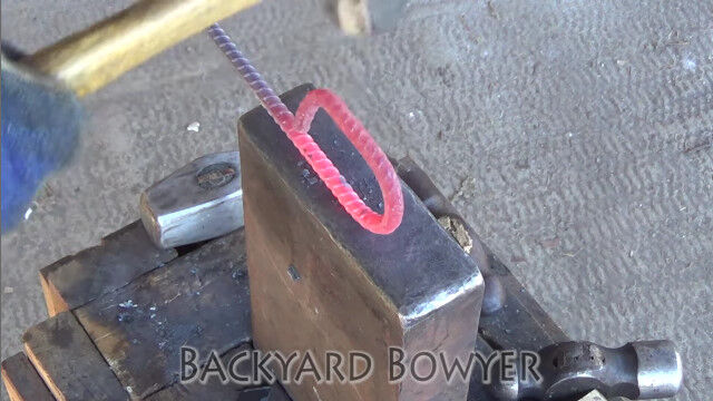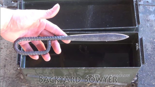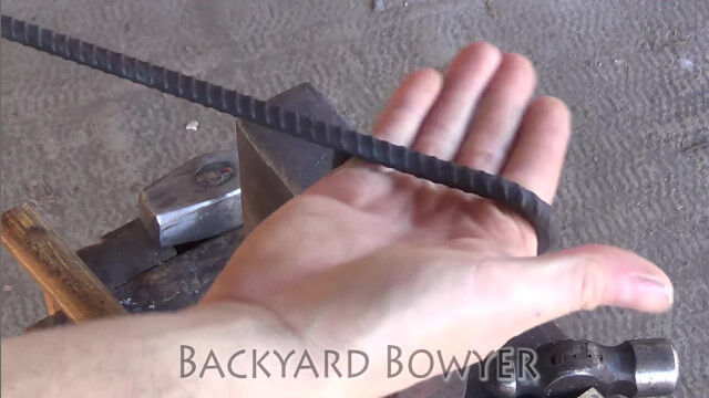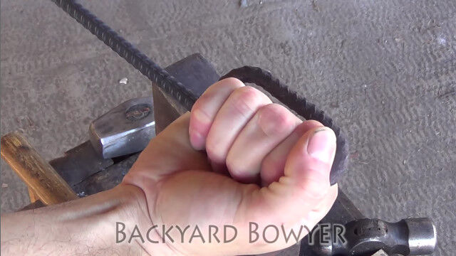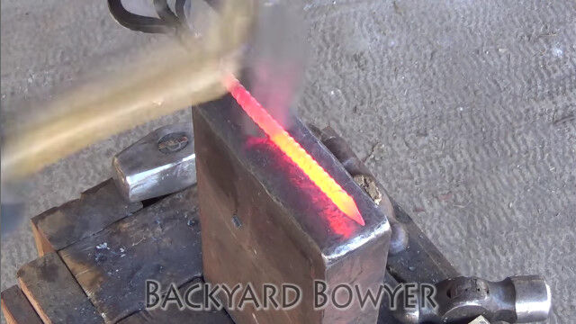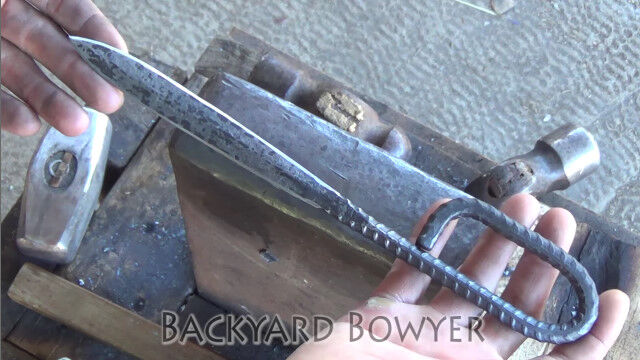 鉄筋の一方を細長く丸めて持ち手にし、もう一方を叩いて伸ばして削り、両刃のナイフとして整える。