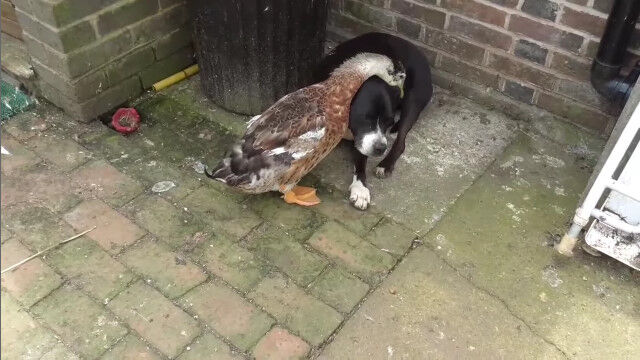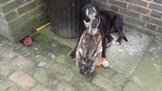 自分よりも体の大きな犬を相手に、まるで我が子に接するように、毛づくろいして慈しむカモのお母さん。