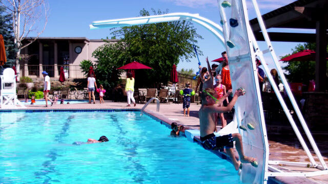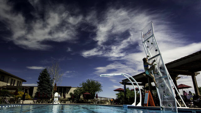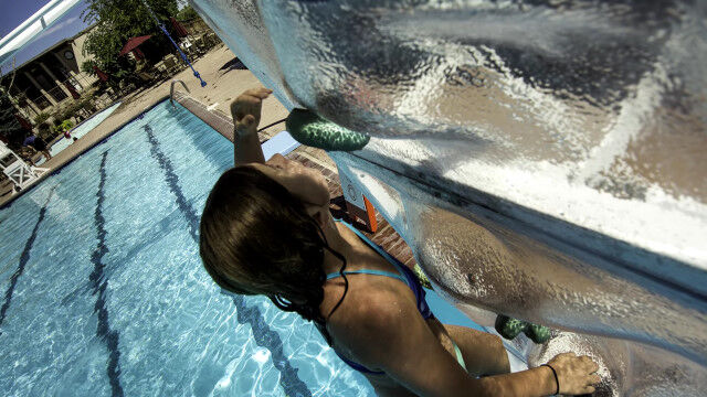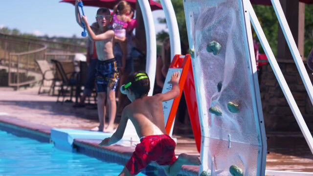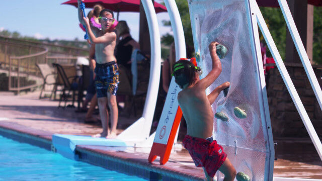プール脇に設置して、安全にボルダリングを楽しむことができるクライミングウォール「アクアクライム」。