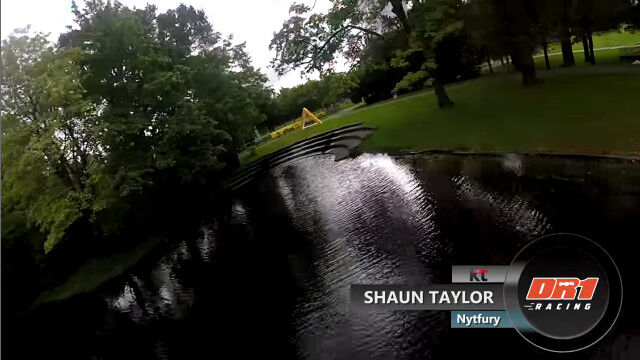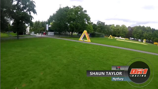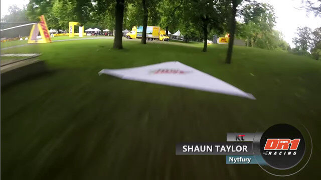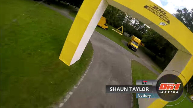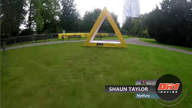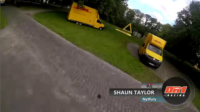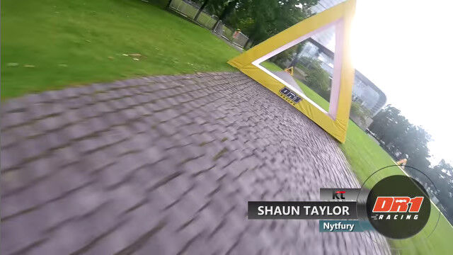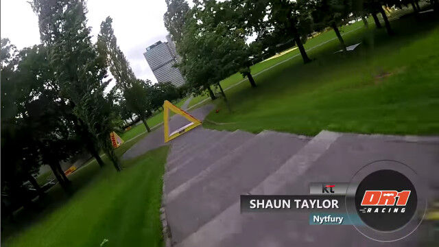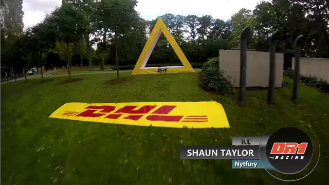 ドイツ、ボンにあるドイツポストの本社ビル前に作られた、ドローンレース用のコースを飛ぶドローン視点の映像。