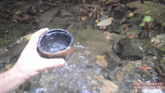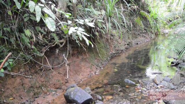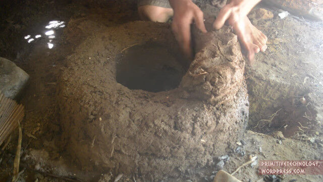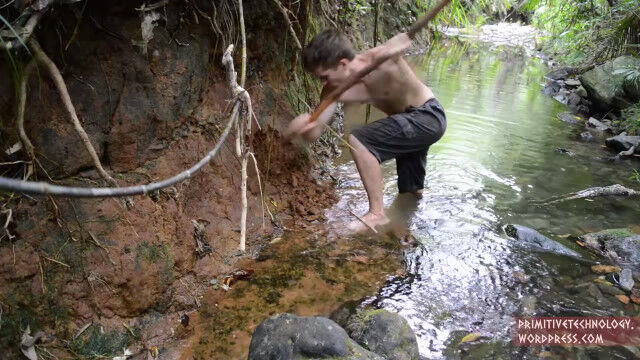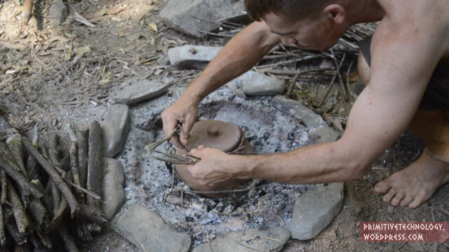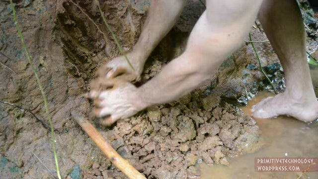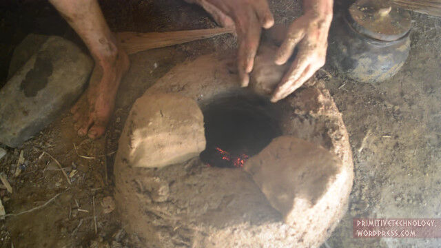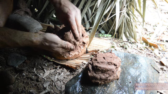 小川の側面にある粘土を掘り出し、細かい石や枝を取り除いて、焚き火の中で野焼き。