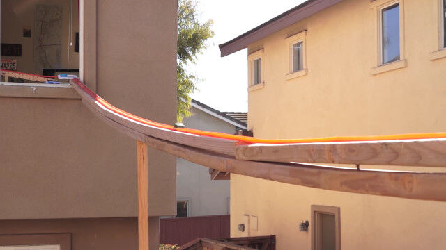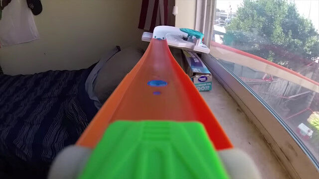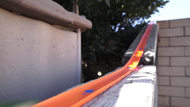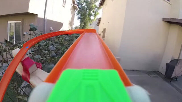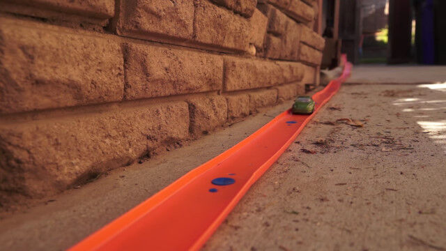オモチャの車、ホットウィールのコースを2階の窓から庭へと伸ばして走らせた映像。