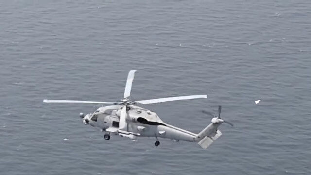 海上を飛行するヘリコプターと並んで飛ぶ、飛行機タイプの小型ドローン。