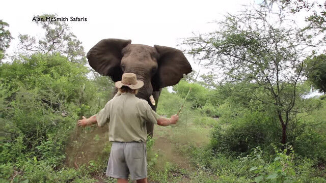 ゾウが突進してきても慌てず騒がず逃げもせず、手にした棒を軽く振りながらむしろゾウへと近づいてしまう。