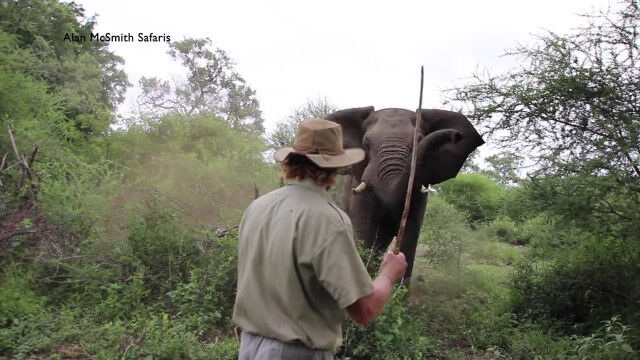 サバンナのガイドとして活動するアラン・マクスミスさんが実演する、荒ぶるゾウを前にした際の対処法。