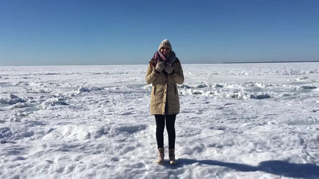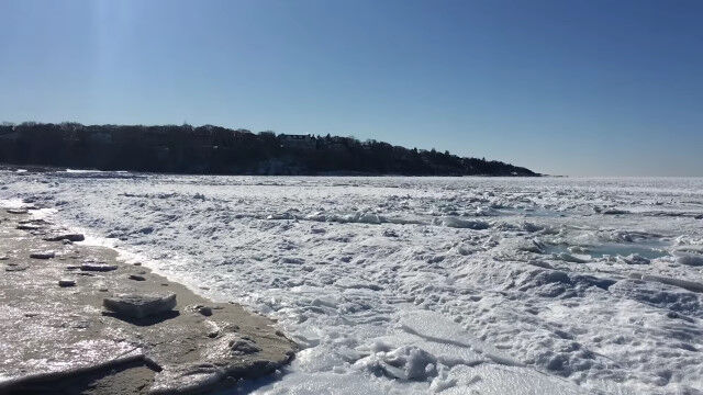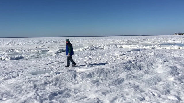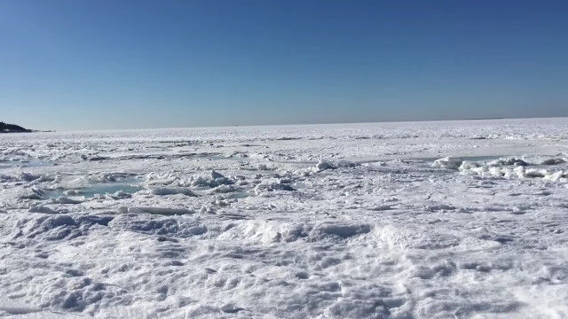 非常に激しいブリザードが襲った影響で、見渡す限りの海がすべて凍りつき、波の上を問題なく歩けるような状況に。