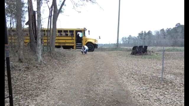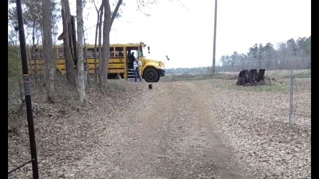 スクールバスがやってくると、飼い主である女の子をお出迎えするために駆け寄っていくニワトリのフロッグくん。