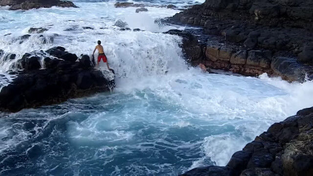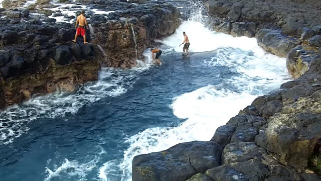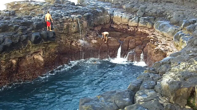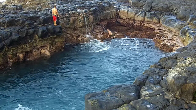 小さな入り江状になったプールは波によって水位が変わるため、飛び込んでから崖上に戻るのが楽である一方、波に押されて落ちてしまったり、危なっかしいけれど楽しそう。