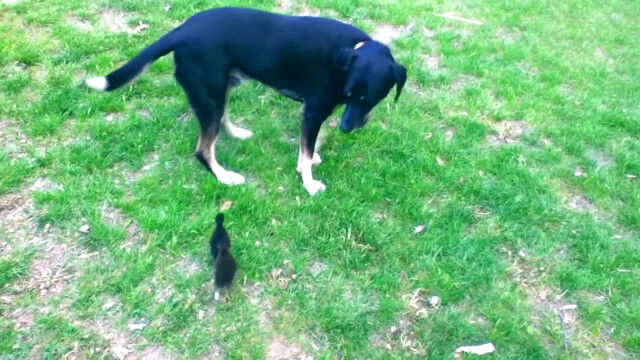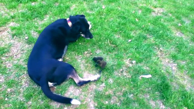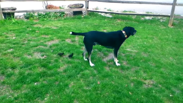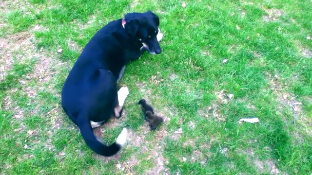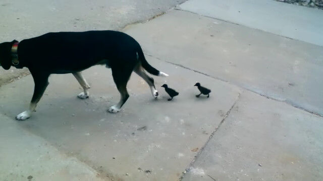 刷り込みによって子ガモから母親認定されてしまったらしい犬。