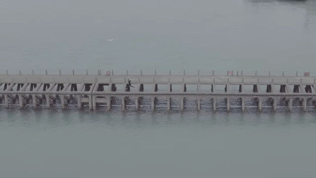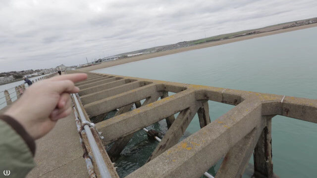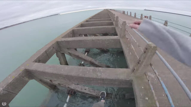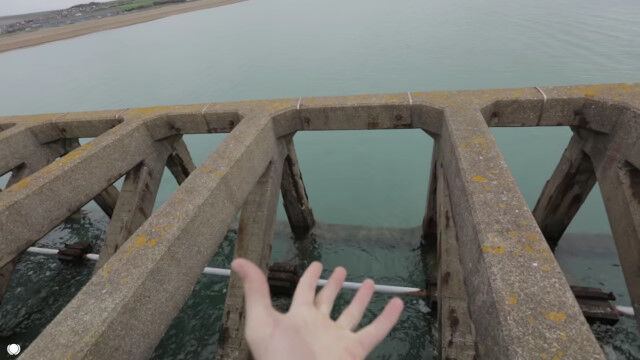 海に突き出した桟橋の隣。人が歩くようには作られていない隙間だらけの道を飛び渡るというチャレンジをする男たち。